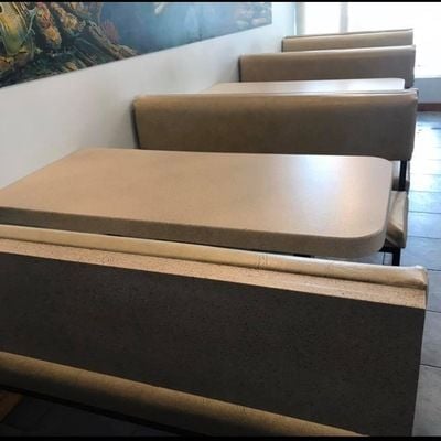 COMMERCIAL RESURFACING DATED 1970s RETRO CAFE DINNING TABLES & CHAIR BACKS. SAVED FROM LANDFILL