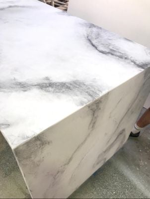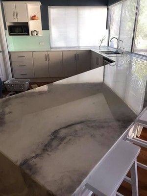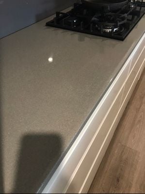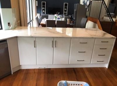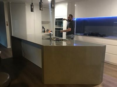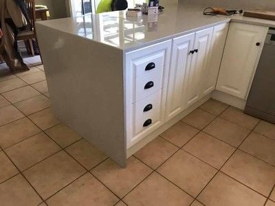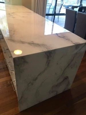 Seamless water fall edge. No join visible in benchtop edge.