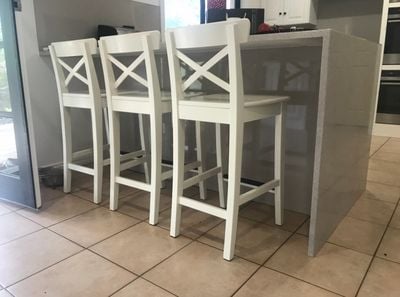 Before Breakfast Bar (front) converted to modern deeper bench with waterfal edge and new handles